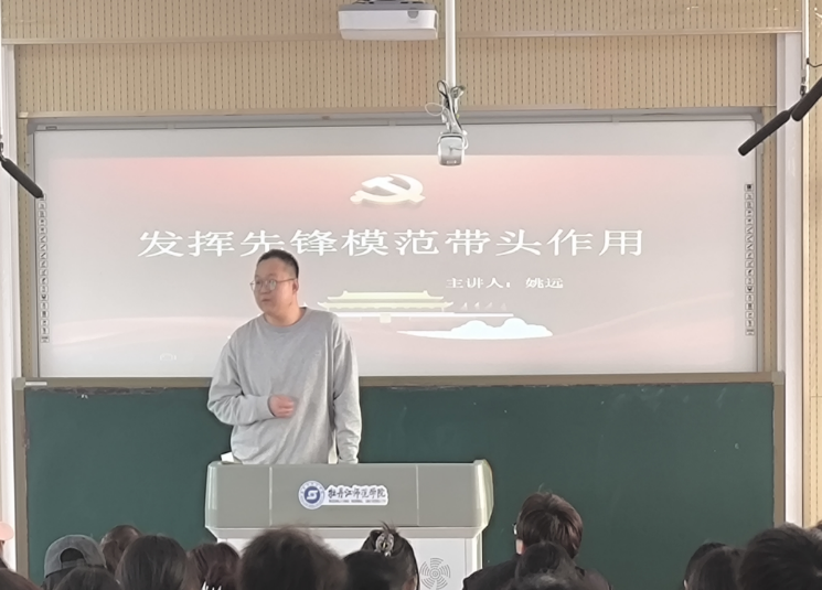 辅导员姚远老师以“发挥先锋模范带头作用”为主题为全体学员开展党课第五讲。姚老师指出全体学员要不断提高政治觉悟和政治能力,自觉用党的创新理论武装头脑,主动践行责任担当,主动发挥先锋模范带头作用,为同学、为班级、为学院做出贡献。