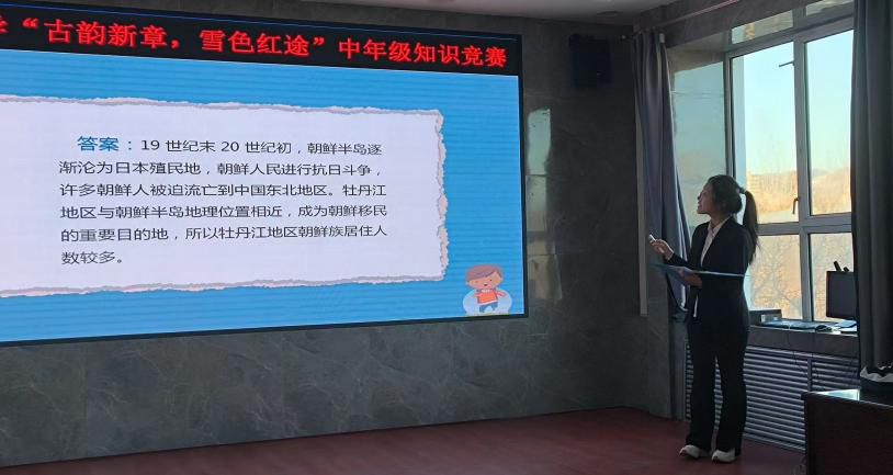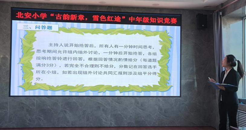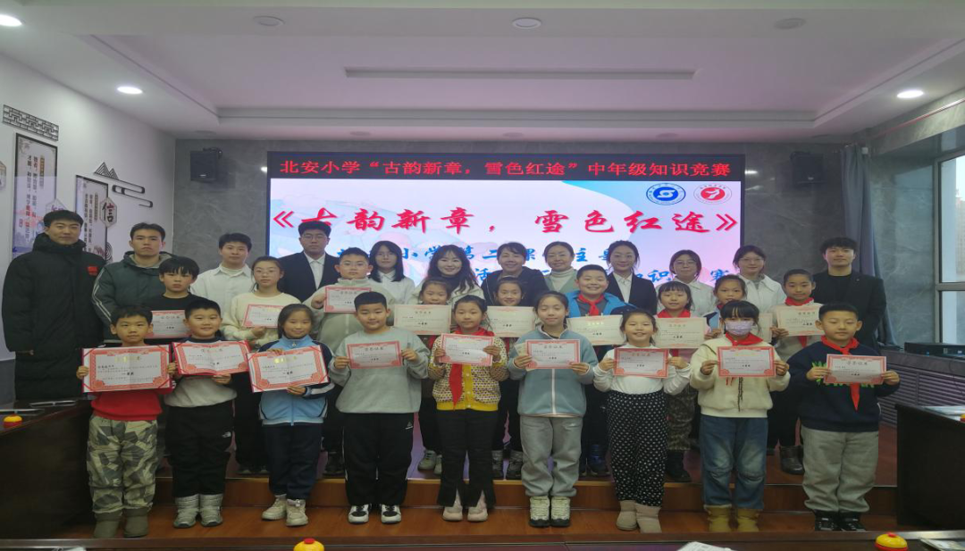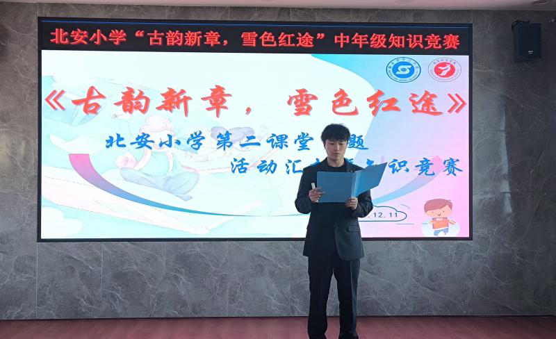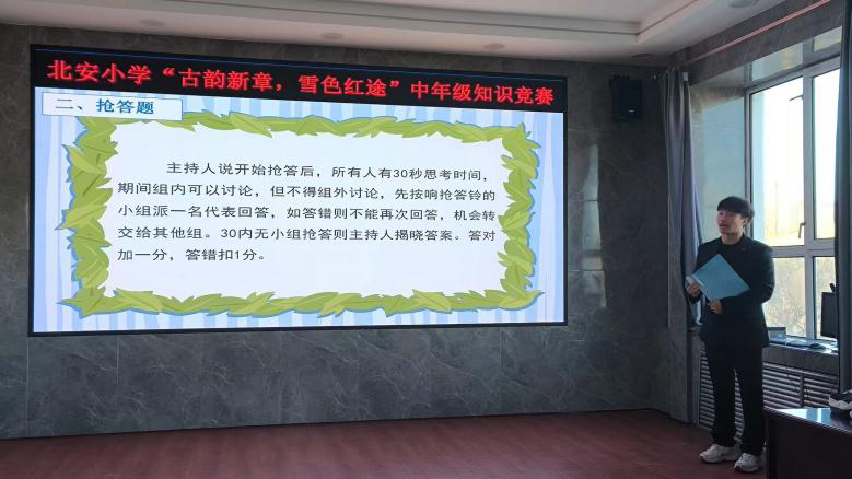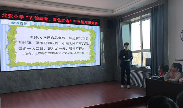 为了巩固北安小学学生通过本学期系列课程获取的知识,总结团队2024下半学期授课成果,“乡育桃李共创坊”团队分别于2024年12月11日、12日下午14时,在北安小学分别针对三、四年级以及五、六年级两个阶段的小学生开展了《古韵新章?雪色红途》知识竞赛活动。
