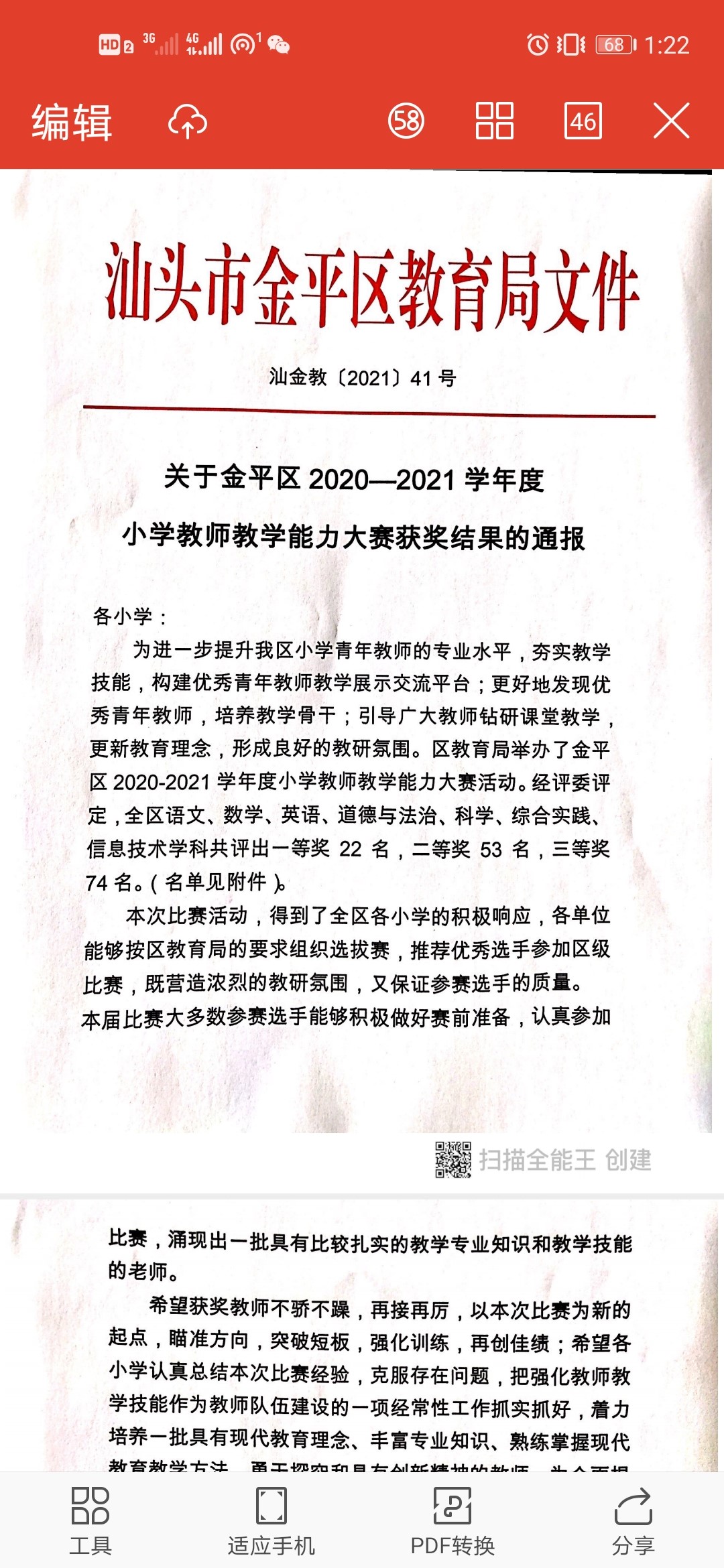 ①《基于教育教学改革,提高教师专业化发展途径》荣获汕头市教育学会2019年学术论文评选二等奖;