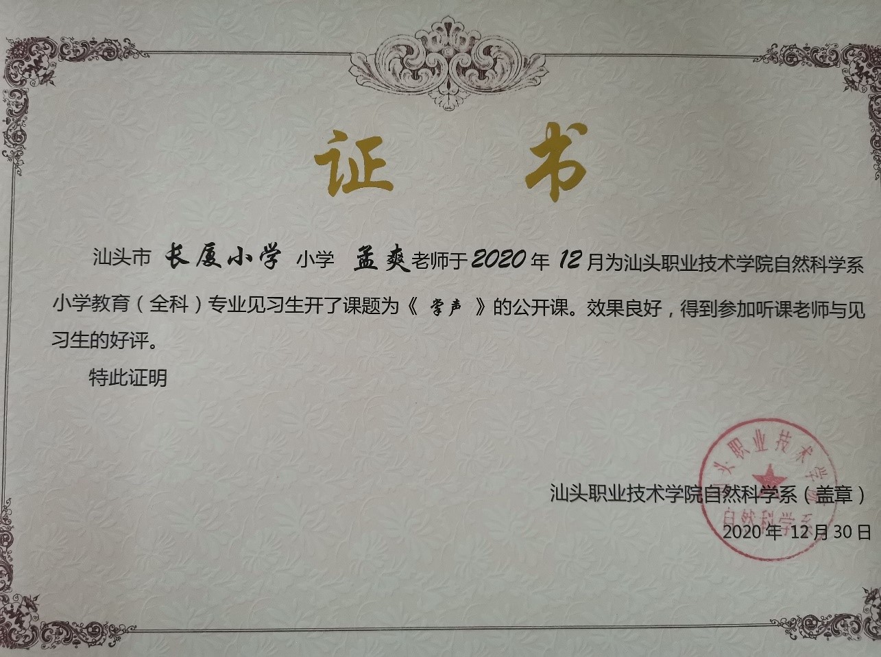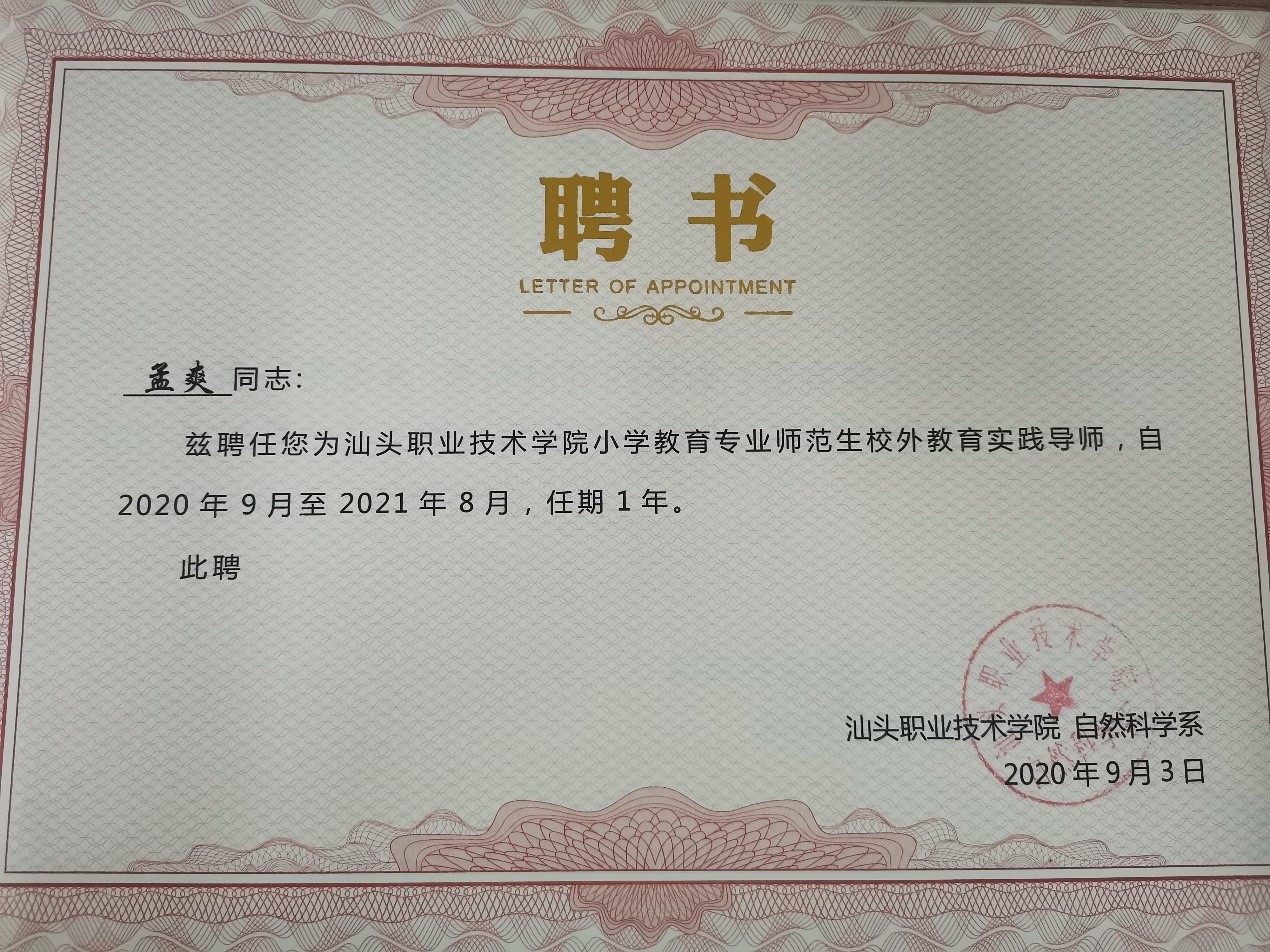 ①2020.9被汕头职业技术学院聘任为小学教育专业师范生校外教育实践导师;