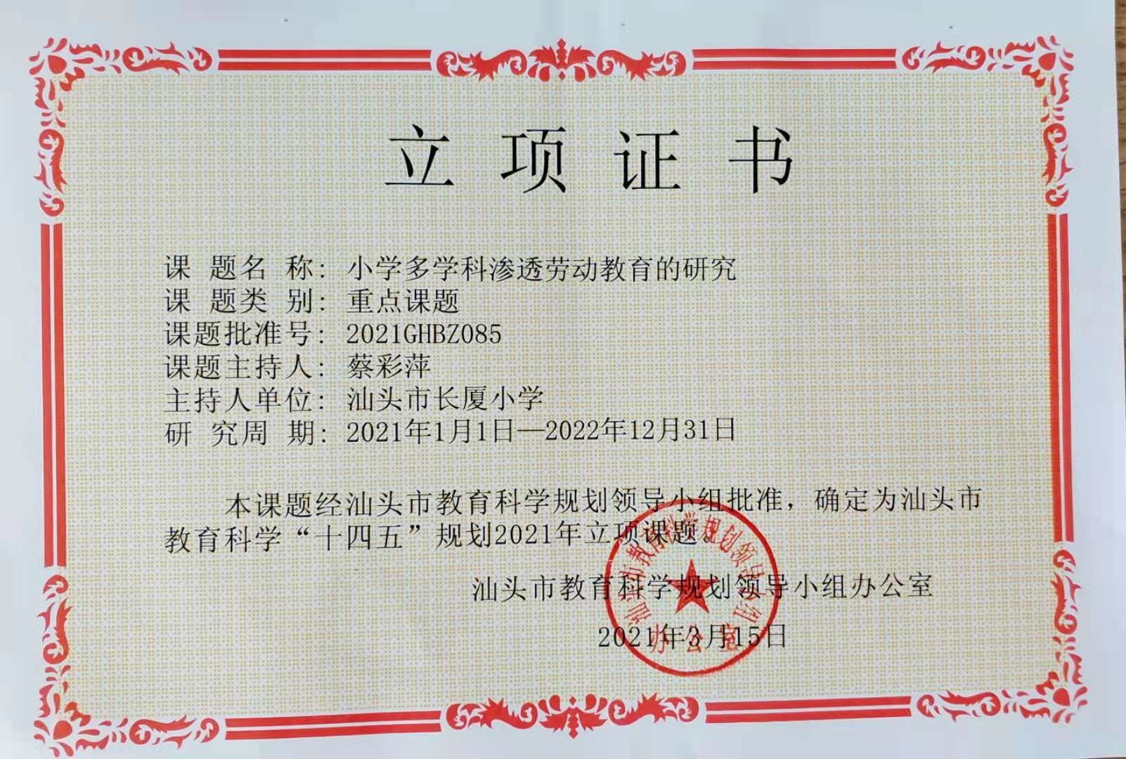 2021.03汕头市重点课题《小学多学科渗透劳动教育的研究》(排名第2)