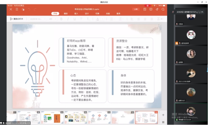 随后,崔雨晴学姐与同学们分享了自己的考研备考经历。崔雨晴学姐从时间安排,到每个科目的具体复习计划,从记忆的角度,到做题的技巧,从复习资料的选择,到帮助学习的小程序、APP等,为同学们提供了具体的复习指导与建议和同学们分享了考研择校问题以及自己的学习方法。她向同学们强调考研中坚定信念、明确目标的重要性,嘱咐同学们认真思考,明确专业和目标,在目标院校的选择方面,要避免盲目跟风,明确适合自己的才是最好的选择。此外,她还希望学弟学妹们在备研的过程中注意自己的身心健康,身体才是革命的本钱。