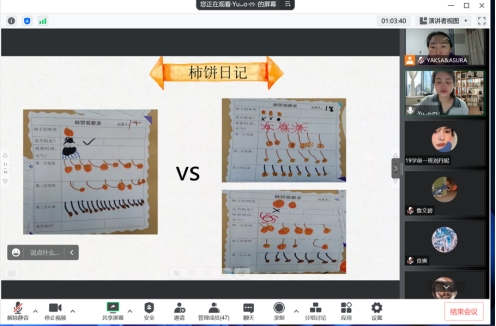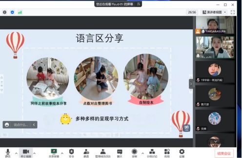 张婉玉学姐通过图片和视频的讲解从幼儿园介绍、一日生活及区域环境介绍、主题安排、主题审议、园本课程五个方面向大家介绍了她所在的杭州市钱塘区星华幼儿园的工作,让学弟学妹们对在幼儿园的工作有了一定的了解。此外,婉玉学姐还分享了个人工作经验及教学方法,包括幼儿园的区角活动、课程安排等,这些工作经验经验对即将步入幼儿教师行列的毕业生们来说十分宝贵。