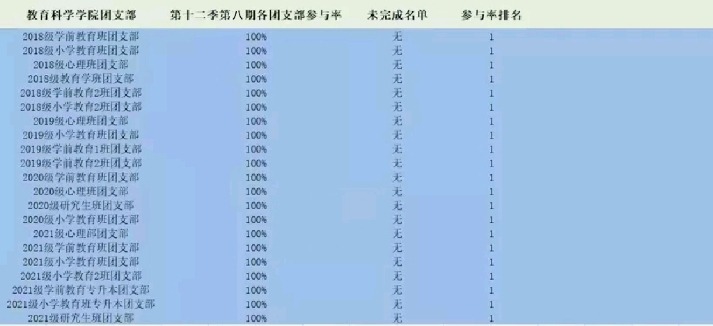 下面公布教育科学学院各团支部参与学习排名情况: