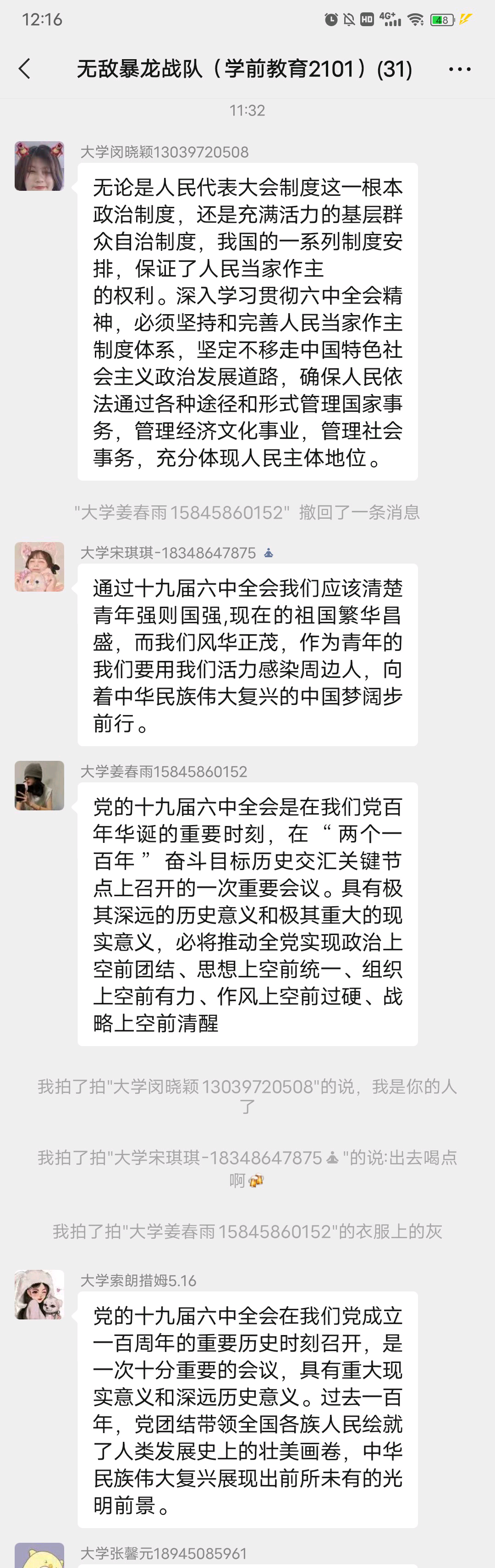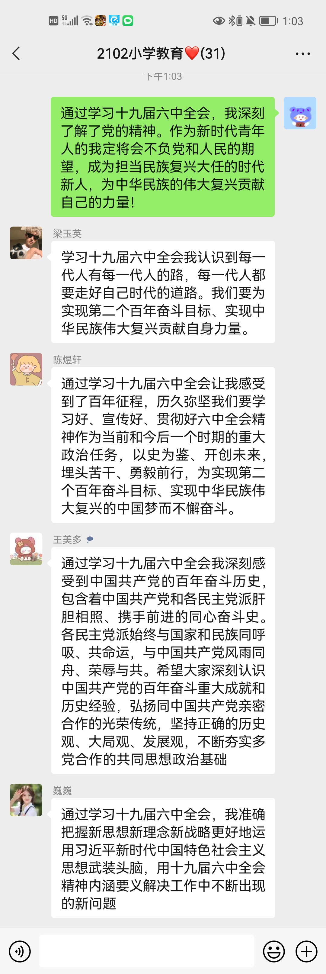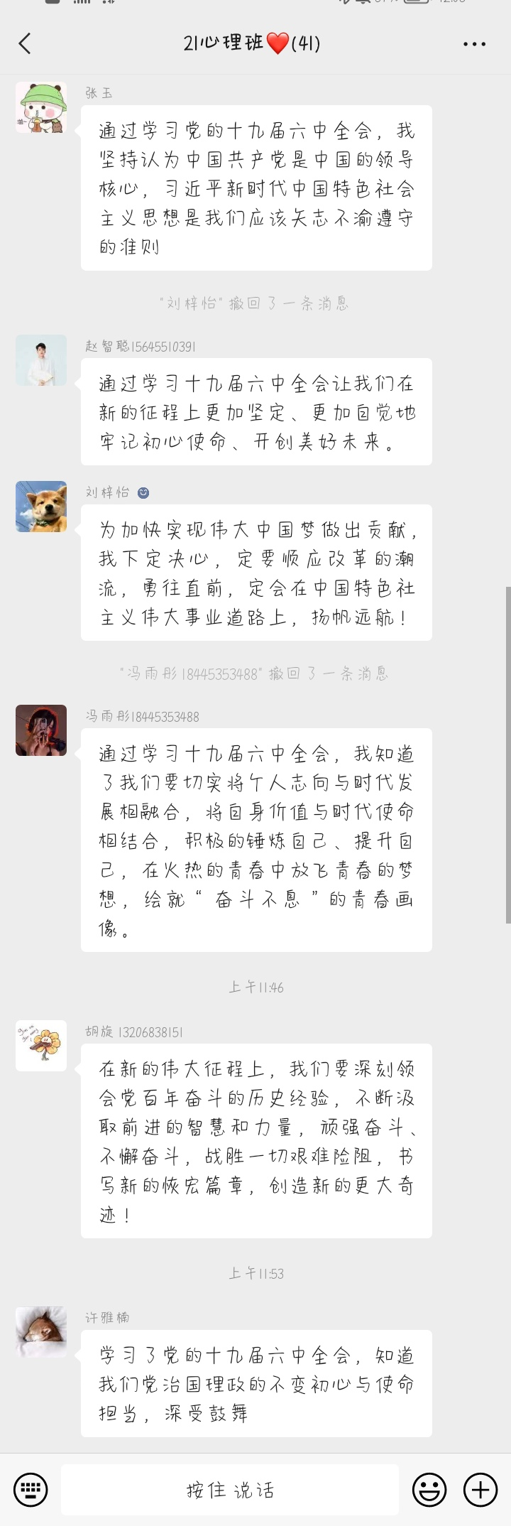 2021年11月8日至11日,中国共产党第十九届中央委员会第六次全体会议在北京胜利召开。此次全会是在建党一百周年之际,在世纪疫情和百年变局交织的复杂背景下,开启新征程的重要节点召开的,具有里程碑、历史性的意义。为进一步学习贯彻全会精神,教育科学学院的团员青年们于2021年11月27日通过线上集中学习、线上交流研讨、自学等多种形式,积极学习领会全会精神,并分享了学习感悟。