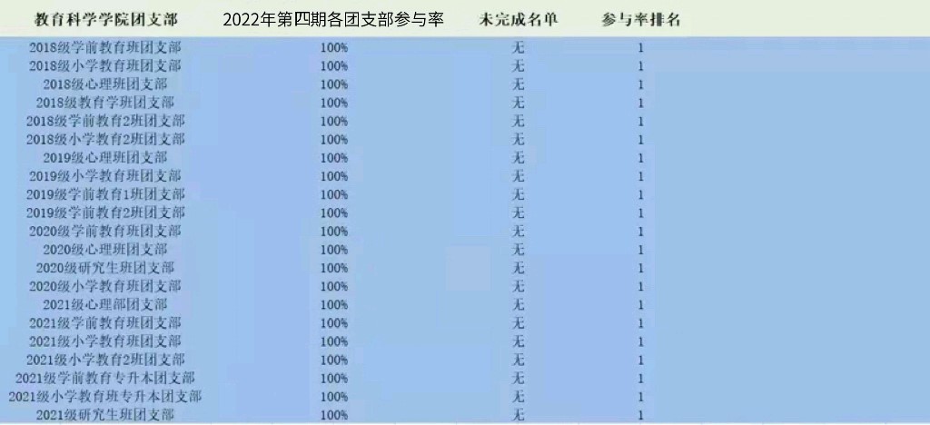 下面公布教育科学学院各团支部参与学习排名情况: