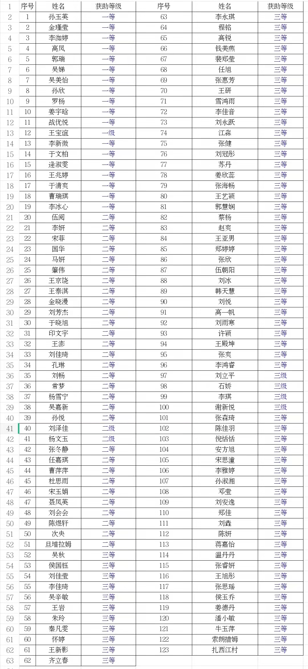 根据学校《关于开展2021-2022学年本科生国家助学金评定工作的通知》要求,为做好国家助学金评定工作,教育科学学院成立三级评定小组,组织实施相关工作,经学生本人申请、班级民主评议、评定工作领导小组讨论研究,确定孙玉英、金瑾莹等123名学生为2021—2022学年国家助学金获得学生。