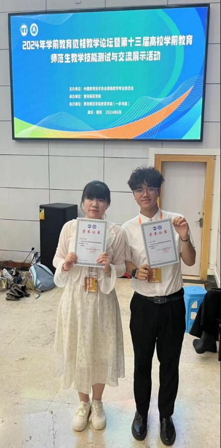 2024年6月24日,由中国教育技术协会微格教学专业委员会主办,黄冈师范学院承办的2024年学前教育微格教学论坛暨第十三届高校学前教育师范生教学技能测试与交流展示活动在湖北黄冈落下帷幕。经过激烈角逐,我院学前教育专业刘佳莹、朴浩男均荣获本科生教育技能测试二等奖。