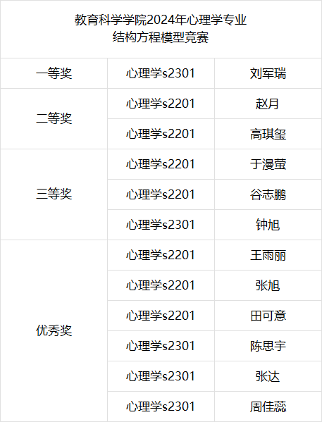 刘军瑞荣获教育科学学院2024年心理学专业结构方程模型竞赛一等奖。